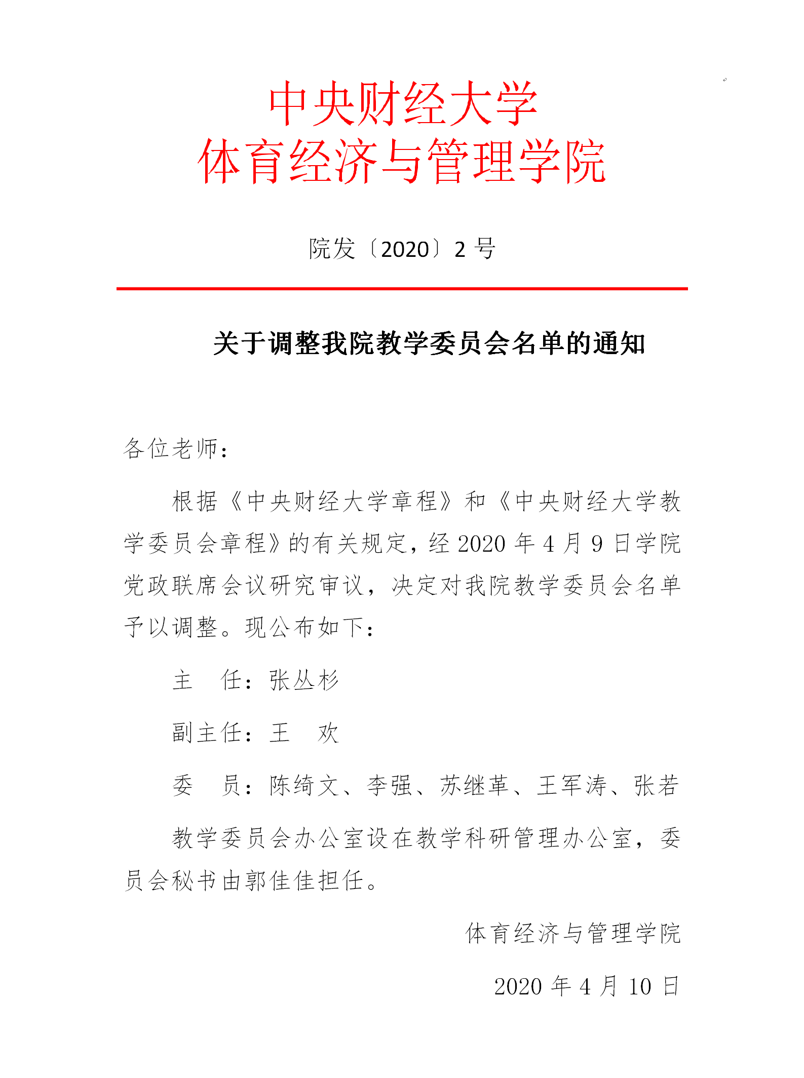院发〔2020〕2号 关于调整我院教学委员会名单的通知