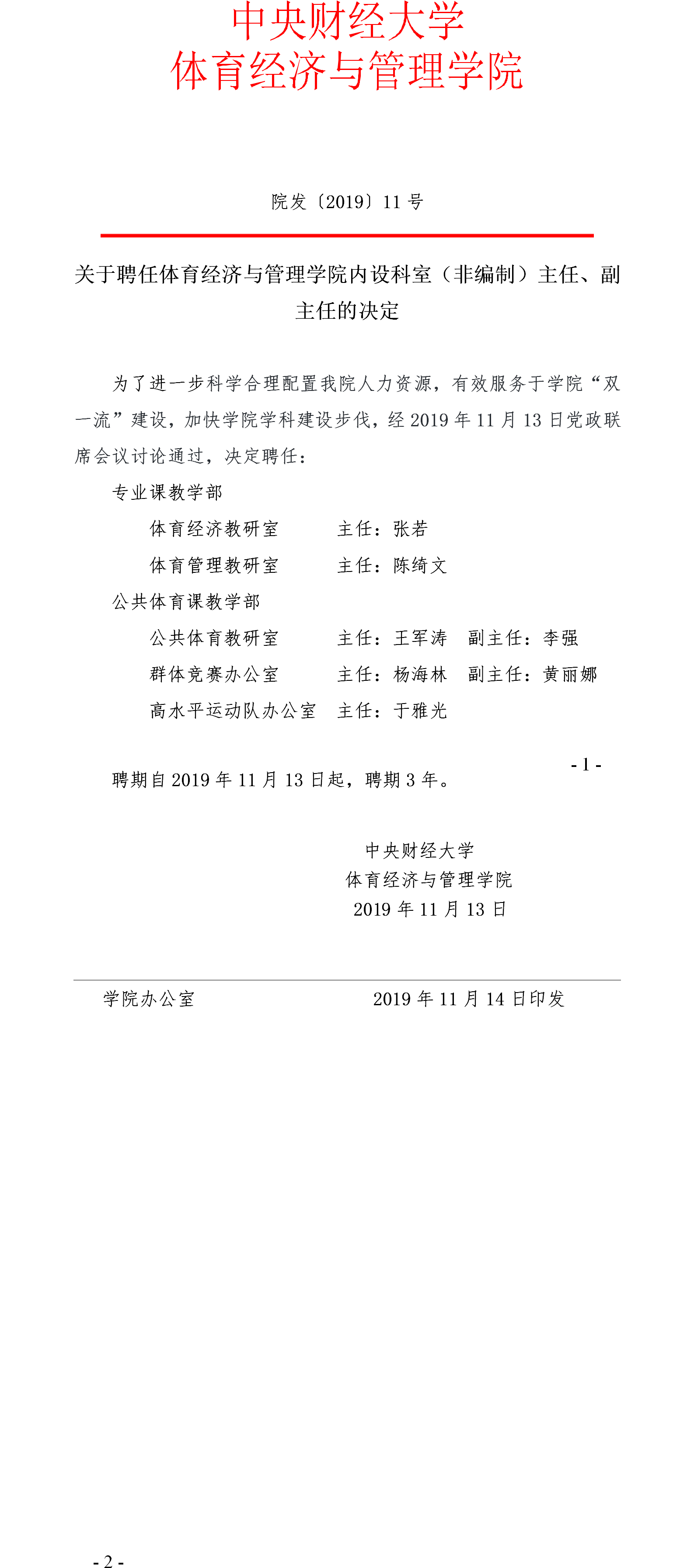 院发〔2019〕11号 关于聘任英国365公司内设科室(非编制)主任、副主任的决定