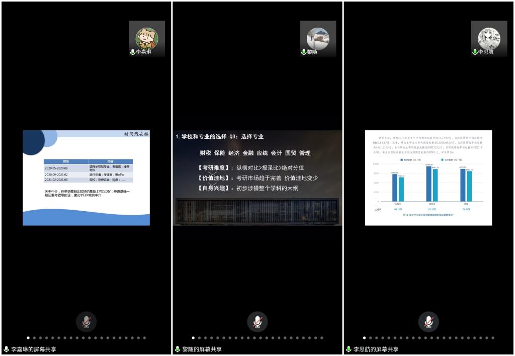 随后,2016级毕业生黎随、李思航、李嘉琳、李凌晨和宾昊分别从考研、找工作、出国、保研等方面进行分享,五位毕业生详细介绍了自己一路走来的心路历程,总结了自己在就业、出国、保研或考研过程中的经验与教训,也为2017级和2018级的学弟学妹提出各自的建议。