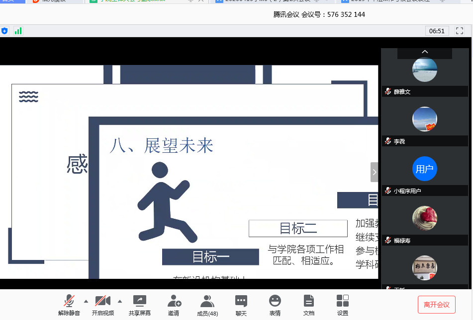 会议伊始,主持人介绍了本次会议召开的背景,由于新冠肺炎疫情的影响,会议采用腾讯会议APP召开线上视频会议的方式开展。根据学校《关于做好2019年中层领导班子和中层干部年度考核工作的通知》精神,会议实到会人数51人,超过了应到人数的三分之二,符合开会条件。会议议程分为三项:一是由林书记代表学院领导班子述职,二是由学院现任领导分别进行个人述职,第三项为梁书记总结讲话。