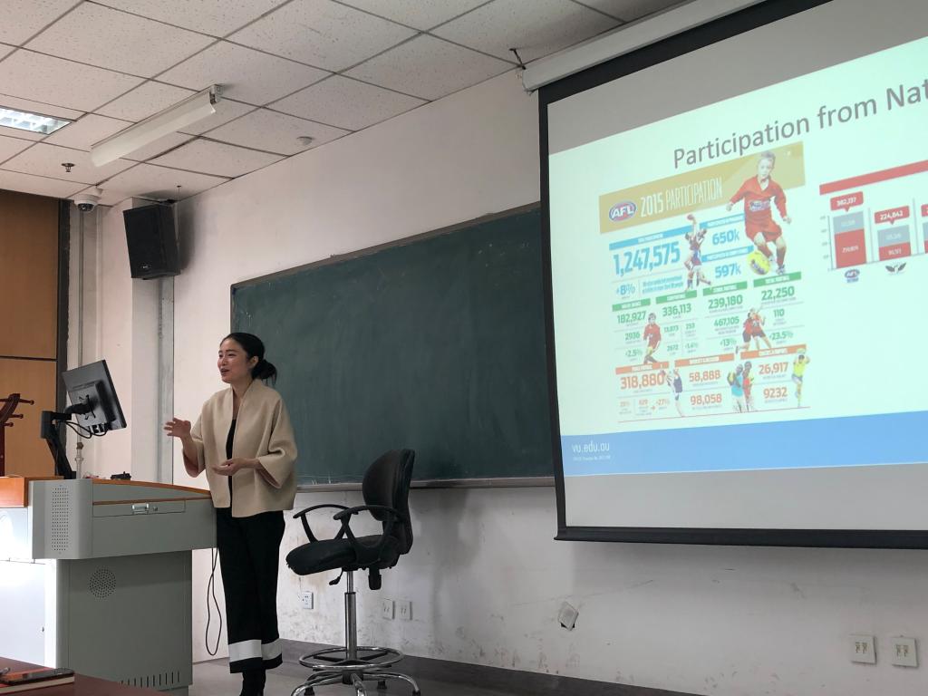 11月12日星期一,应我院王裕雄老师邀请,来我院参加学术研讨会的澳大利亚维多利亚大学商学院Catherine LOU博士为2016-1班《体育组织管理》课程授课,向大家介绍澳大利亚职业体育组织管理。LOU博士对澳大利亚体育产业价值链有深入研究,与澳式足球联盟AFL以及Football Federation Victoria有很好的合作关系,并作为专家多次参与上述运动联盟的活动和会议。