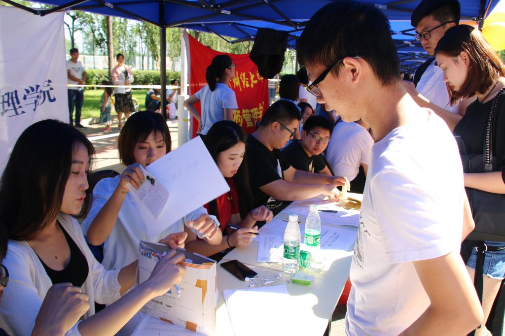 9月7日上午,迎新工作正式开始。2017级辅导员张振磊老师、我院学生会主席团成员和2017级班级工作助理在迎新现场接待新生。指导新生注册,嘱咐新生注意事项,并将有关材料发放到新生手中。学院党委书记林琼老师也亲临现场指导招新工作。院学生会志愿者们在场协助帮忙,现场井然有序。新生报到完成后,负责楼宇引导的志愿者热心的将新生领到相应的宿舍楼,并为其介绍宿舍生活的基本常识和相关事宜。在迎新工作进行的过程中,校党委书记傅邵林、校长王广谦、校党委副书记梁勇、副校长王瑶琪等多位校领导也先后来到迎新现场对新生展开了慰问,热烈欢迎了前来报到的新生。为新生们送去了诚挚祝福。