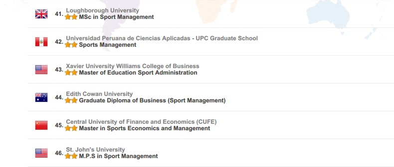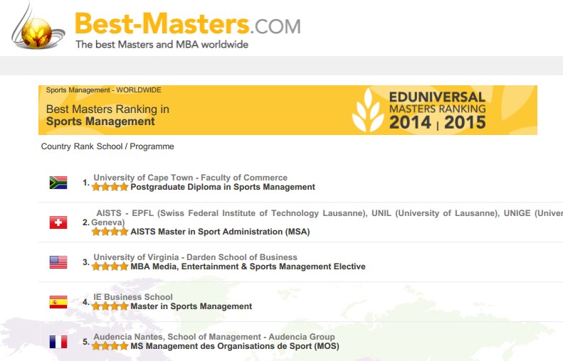 在最新年度(2014-2015)的《Best-Master世界硕士项目专业排名》中,我院体育经济与管理专业的研究生(硕士)专业跻身世界五十强,排名第四十五位。这是中国体育管理研究生专业首次跻身世界顶级院校行列。