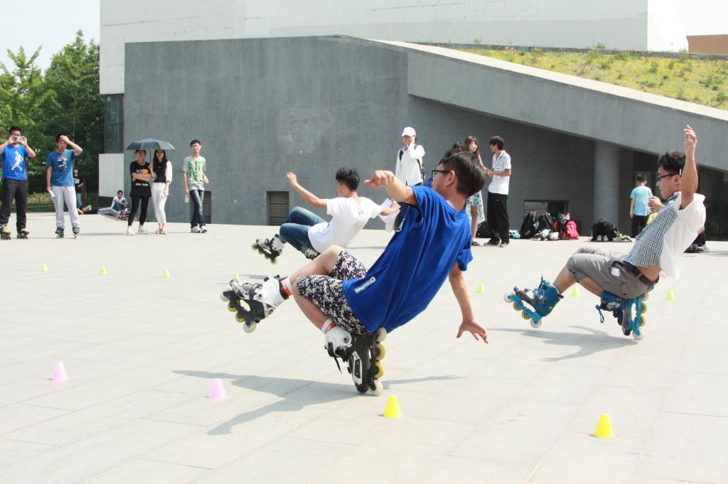经历了上午的速滑比拼,选手们中午稍事休息后移师至大学生活动中心前小广场,在动感的背景音乐下开始了赛前表演,美感、舞步、跳跃、旋转是花样轮滑的核心,选手们用精彩绝伦的技巧赢得了观众的一阵阵喝彩,场上的每一分钟都代表着他们在场下的勤学苦练与坚持不懈。轮滑炫技仅仅只是热身,随后选手们进行了男女子组个人花桩赛、团队花桩赛和基础刹车赛四个比赛项目的角逐,虽然没有速度轮滑那样的激烈竞速,但花滑有着其本身独有的魅力竞争,各高校的比赛选手都展现了自己的最高水平,团队花桩赛相较于个人速桩赛更重视个人技巧和团队协作的结合。刹车赛是整个比赛中难度最高的项目,参赛选手们展示出的高超技巧震惊全场,将比赛推到了新一轮高潮。