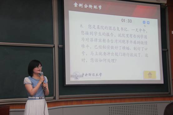 中财首届辅导员职业能力大赛由我校学生工作部和研究生院联合主办,面向校内在编在岗的一线专职辅导员开展,活动旨在推进辅导员队伍专业化、职业化建设,提高辅导员工作技能和水平。此次大赛分为初赛、决赛两个阶段,通过初赛笔试的基础知识测试、公文写作、博文写作环节,选拔出10名本科生、研究生辅导员进入决赛。决赛分为上下两个环节。第一环节包括案例分析,第二环节为谈心谈话情景再现和现场问答,涵盖思想政治教育、社会学、心理学、管理学、教育学等相关学科知识和方法,对辅导员开展大学生思想政治教育的能力进行了全方位考察。