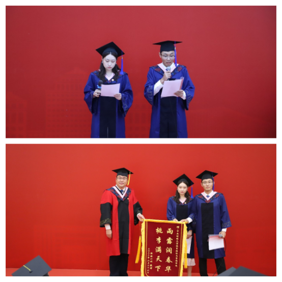 2023届研究生毕业生为学院送上锦旗,祝福学院“雨露润春华,桃李满天下。”