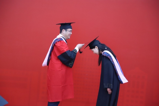 院长张本家教授为每位毕业生拨转流苏,并颁发学历和学位证书