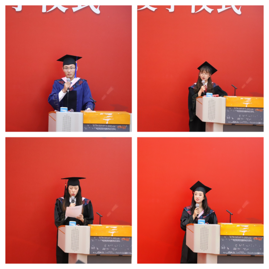 毕业生代表高玉鹏、黄敏、赵诗颖、刘奕轩同学依次上台发言。他们回顾了数年的大学生活,讲述着点点滴滴的美好与热烈,由衷地表达了对学校、老师以及家人朋友们的感谢。