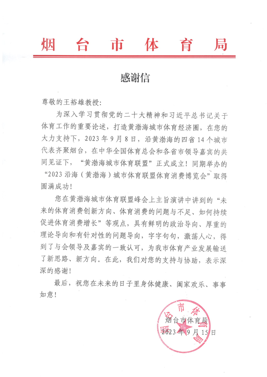 9月15日,烟台市体育局向我院王裕雄教授发来感谢信,感谢王裕雄教授在“黄渤海城市体育联盟峰会”上为烟台市体育产业发展输送了新思路、新方向。