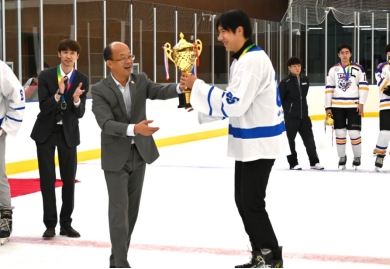 学院和学校的领导非常重视冰球队的比赛。决赛当日,外国语学院党委书记冯俊波、邵珊珊老师和体经学院党委书记宋立岩、副书记陈绮文、副院长张丛杉一起来到赛场给同学们加油助威。完赛后,由宋立岩书记向队长李子豪同学颁发高水平组冠军的奖杯。