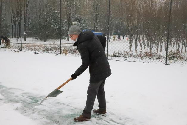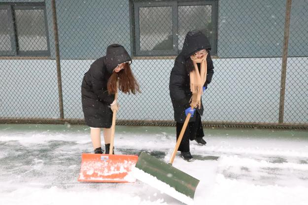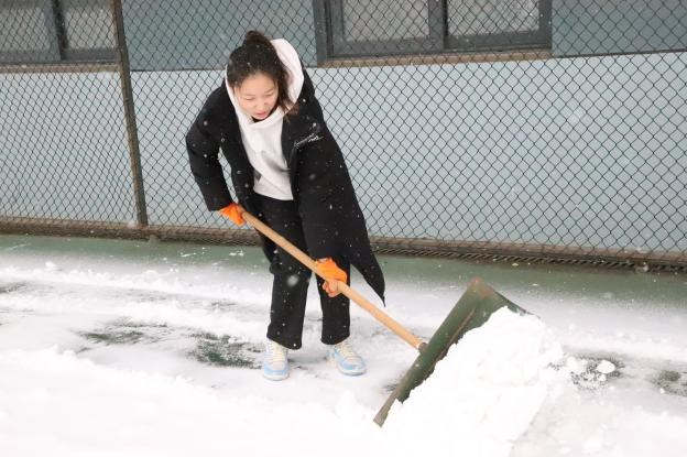 早晨9点,随着第一缕阳光洒在雪白的校园,师生党员们齐聚体育馆,手持扫雪工具,满怀热情地投入到了这次劳动之中。面对铺天盖地的雪景,大家分工明确,有的负责清扫人行道,有的负责清理运动场地,还有的负责田径场入口区域。在寒风中,大家的动作迅速而有序,每一次铲雪、每一次扫除都充满了节奏和力量。