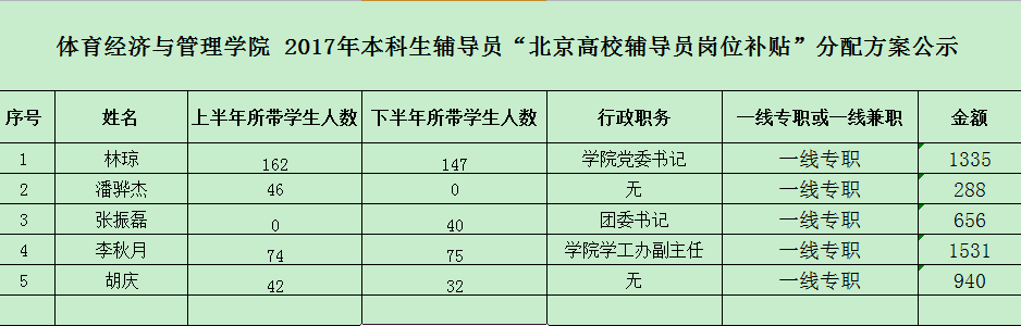 根据《关于做好2017年本科生辅导员“北京高校辅导员岗位补贴”发放工作的通知》和《英国上市公司365“北京市辅导员岗位补贴”发放办法》(校发〔2009〕117号)制定学院发放方案。公示期间如有异议请与英国365公司学生工作办公室联系。