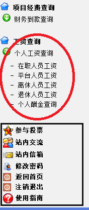 3.点击个人工资查询—在职人员查询(或平台人员查询)、个人工资查询—个人酬金查询,选择对应的界面查询个人工资及个人酬金。