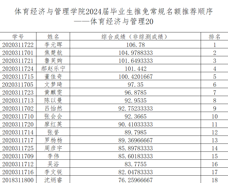 1、常规推免名额(4个),根据班级人数在1班、2班进行分配,2020级为1班3个名额,2班1个名额。每个班级以学生综合成绩在本专业从高到低进行排序,综合成绩相同时,按学分加权平均分从高到低排序。综合成绩计算公式如下: