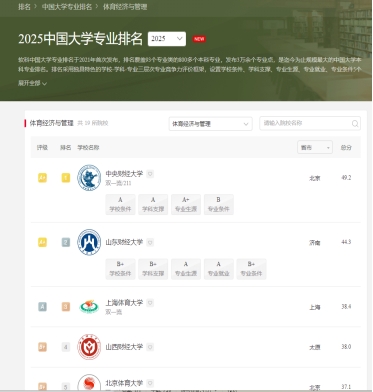 据软科官方数据,本次评价覆盖全国93个专业类、800多个本科专业,采用"学校-学科-专业"三级评价体系。在体育经济与管理专业领域,全国仅19所高校入围榜单,我院凭借雄厚实力脱颖而出: