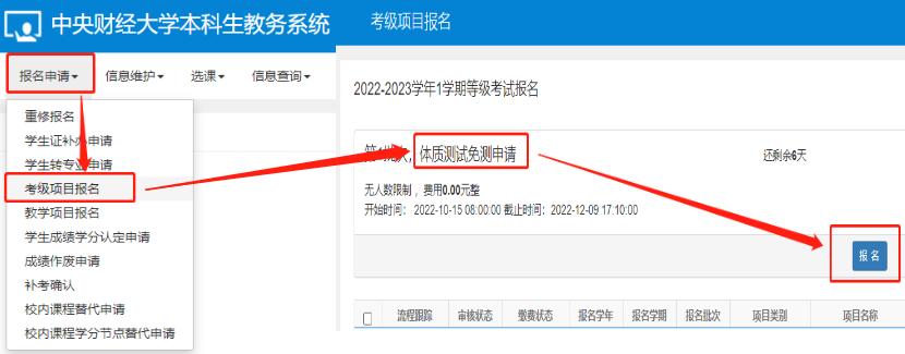 (六)报名路径:登录教务系统-报名申请-考级项目报名-体质测试免测申请。