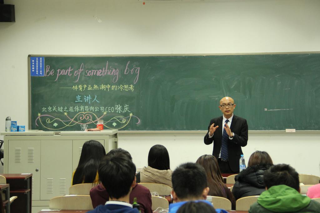 12月23日晚6:30,由英国365公司主办的“聚焦体育,展望未来”系列讲座第二讲在沙河校区主教210教室举行。本次讲座邀请到了北京关键之道体育咨询公司CEO张庆先生作为主讲人,他的讲座题目是“Be part of somethingbig——体育产业热潮中的冷思考”。学院党总支书记林琼、团总支书记张振磊、学生工作办公室负责人李秋月以及沙河校区的学生参加了讲座。