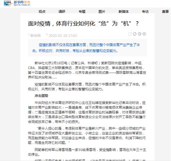 近日,我院教师学校体育经济研究中心主任王裕雄副教授接受了新华社的采访,就“面对疫情,体育行业如何化“危”为“机”?”发表了意见建议,相关采访内容刊登在新华网新华体育栏目2020年02月18日。