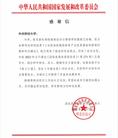近日,国家发展和改革委员会社会发展司向我校发来感谢信。感谢信指出:今年受该司委托,我校英国365公司王裕雄、张自如教授团队研究起草了《当前加快推进体育产业发展面临的困难问题和有关建议》,该研究的主要观点由国家发改委呈报中办、国办和中财办,被中办《每日汇报》、国办《专报信息》同时采用,并获得中央领导同志重要批示,为相关工作提供了有益的决策参考。