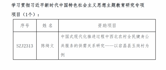 为深入学习贯彻习近平新时代中国特色社会主义思想和党的二十大精神,认真落实学习贯彻习近平新时代中国特色社会主义思想主题教育要求,我校教师工作部于2023年5月启动了本年度“红色擎,龙马行”之教师“思政+”专项支持基金项目遴选工作。经个人申报、单位推荐、学校专家组评审,确定资助我院陈绮文副教授《中国式现代化推进过程中西北农村全民健身公共服务的供需关系研究——以宕昌县玉岗村为例》一个学习贯彻习近平新时代中国特色社会主义思想主题教育研究专项项目。