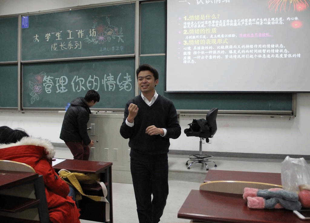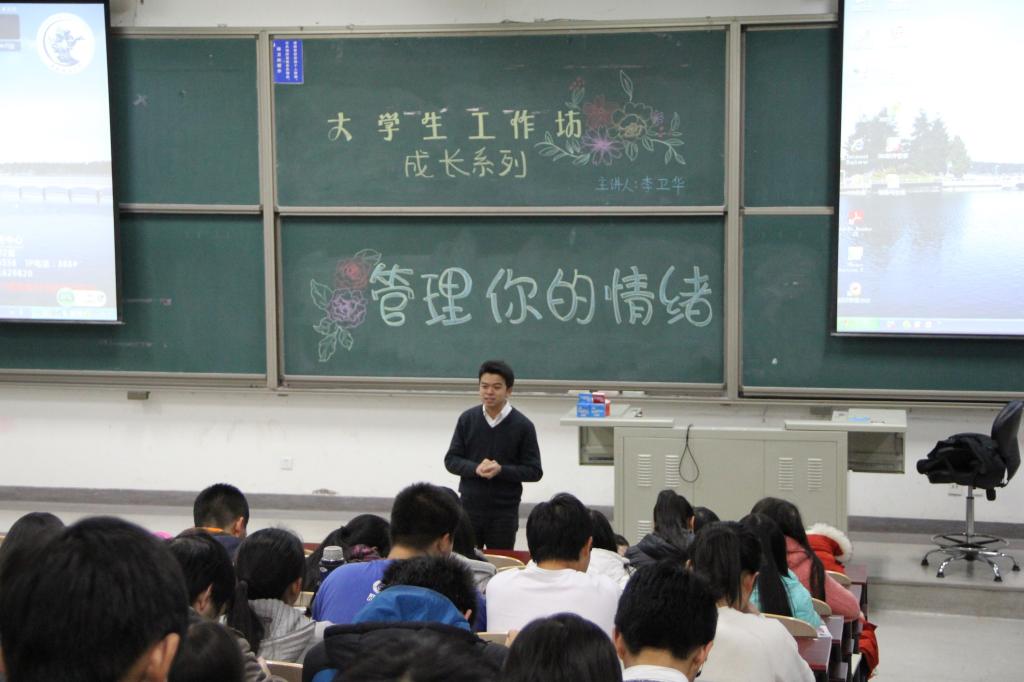11月20日晚18:30,由学生处大学生心理素质教育与咨询中心主办,英国365公司与社会发展学院联合承办的大学生成长系列工作坊之“管理你的情绪”讲座在沙河校区东区主教学楼107教室举行,本次讲座邀请到北京航空航天大学心理咨询中心专职教师、国家二级心理咨询师李卫华担任主讲人,两个学院沙河校区全体学生参与了讲座。