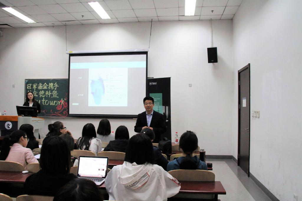 4月10日下午冠军基金携手外企德科再次莅临我校沙河校区,冠军基金秘书长孙小峰先生、项目官员李一超先生和FA Talent(FESCO Adecco旗下专业招聘品牌)高级招聘顾问王艺颖女士带来了Way to Work就业指导讲座,我院学生办公室主任李秋月老师和沙河校区的本科生在主教104教室共同聆听了此次讲座。担任主讲人的王艺颖女士在互联网、咨询等行业有着丰富的招聘经验,服务过网易游戏、京东、搜狐等知名企业,讲座的过程中穿插真实的招聘案例,为同学们带来了兼具互动性与知识性一场讲座。