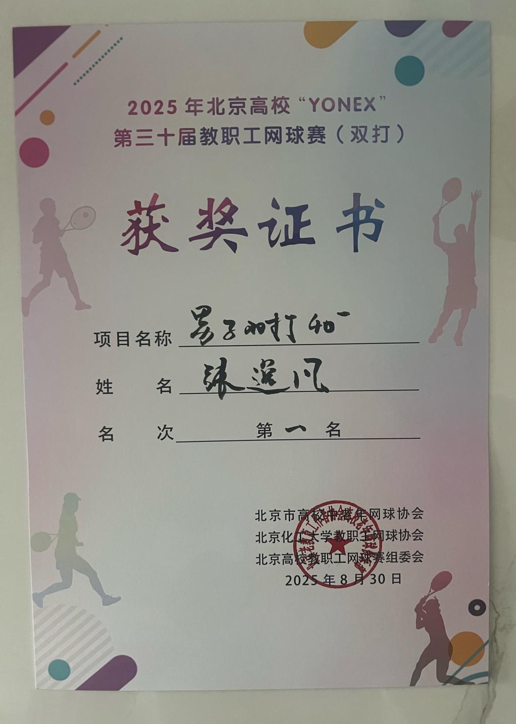 北京市高校教职工网球赛于8月30在北京化工大学举办,此赛为北京市高校教职工规模最大的年度网球赛事,来自清华大学、北京大学、中国人民大学、北京航空航天大学等近30所高校的200多名教职工参与其中,我院教师张逸凡继去年获得40岁以下男双冠军后,今年与搭档以全胜战绩成功卫冕。