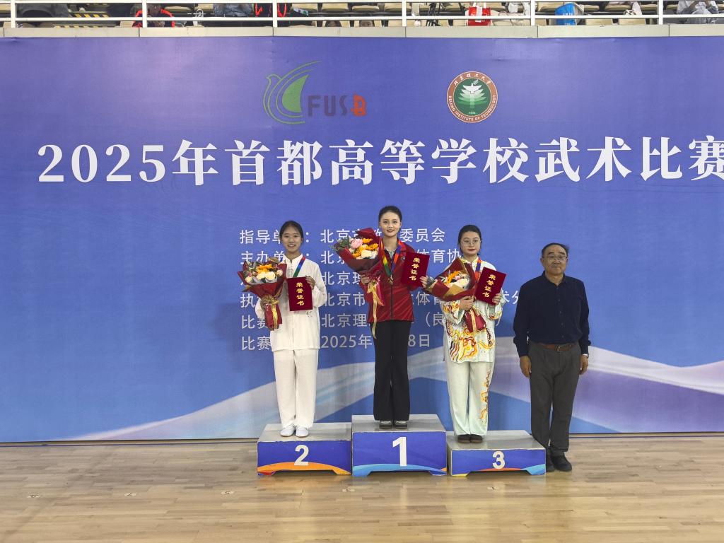 2025年11月8日,由北京市大学生体育协会主办的首都高等学校武术比赛在北京理工大学(良乡校区)圆满落幕。作为首都高校武术领域的标杆性赛事,比赛吸引了各高校400余名运动员同台竞技。我校参赛学子发挥出色,最终荣获 1 枚银牌、3 项前八名的优异赛绩。同时,凭借良好的参赛风貌,队伍荣获集体“体育道德风尚奖”、个人“优秀运动员” 称号。