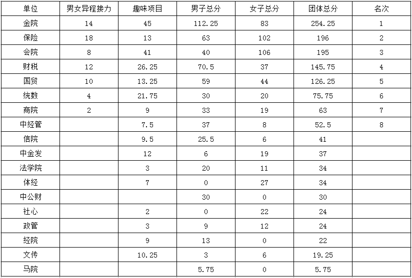 根据2018年3月15日召开的春季运动会准备会讨论结果决定:本届运动会趣味项目的记分办法不采用往年的双倍计分办法,而采用单项计分办法,即参照径赛单项予以计分,1至8名的得分依次为9、7、6、5、4、3、2、1。