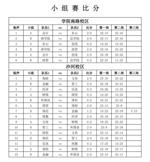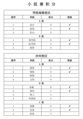 南路校区A组会计学院与B组商学院以绝对实力成功晋级,创发学院、法学院紧随其后。沙河校区A组国贸学院实力雄厚,保险学院随即锁定半决赛席位;B组赛事更加胶着,金融、体经不相上下,在激烈的比赛中两院成功晋级。C组统数学院、信息学院奋力拼搏,在团队齐心协力之下成功出线。