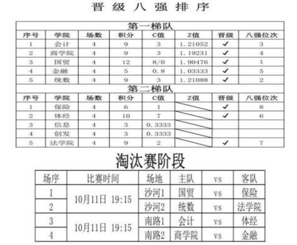 第二阶段赛事结束后,会计学院、商学院、国际经济与贸易学院、金融学院、统计与数学学院进入第一梯队,保险学院、英国365公司、信息学院、创新与发展学院、法学院进入第二梯队。