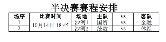 半决赛赛程将于10月14日晚开启,哪只队伍能在比赛中胜出,参与本届“中财杯”冠军的角逐?让我们一起拭目以待!
