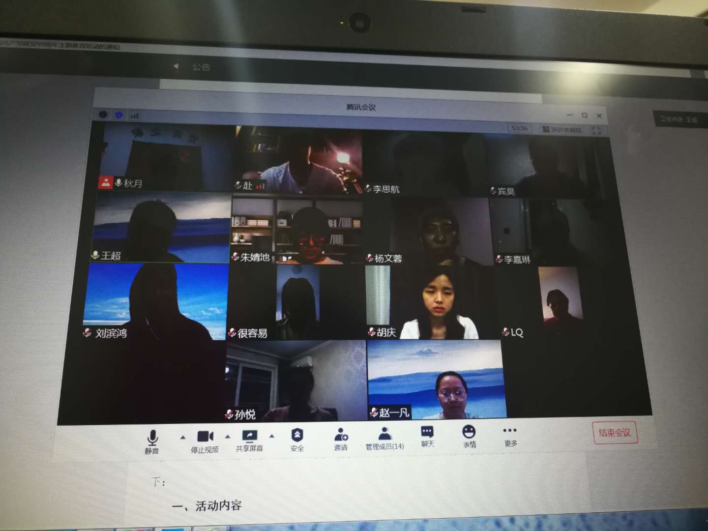 6月22日,学院第一学生党支部在腾讯会议平台(会议号:105582373)召开云端党支部大会,会议由李秋月书记主持,林琼老师和全体第一学生党支部成员参会。会议主要围绕两方面内容展开,一是就预备期已满一年的李思航同志展开的转正会议;二是党支部围绕毕业展开座谈。