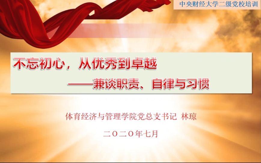2020年7月9日晚7点,我院二级党校利用腾讯会议平台,面向全院入党积极分子组织了题为“不忘初心,从优秀到卓越——兼谈职责、自律与习惯”的线上专题微党课。学院党总支书记林琼教授主讲了本次党课。第二学生党支部书记杜文竹、研究生辅导员许特然参加了本次学习。