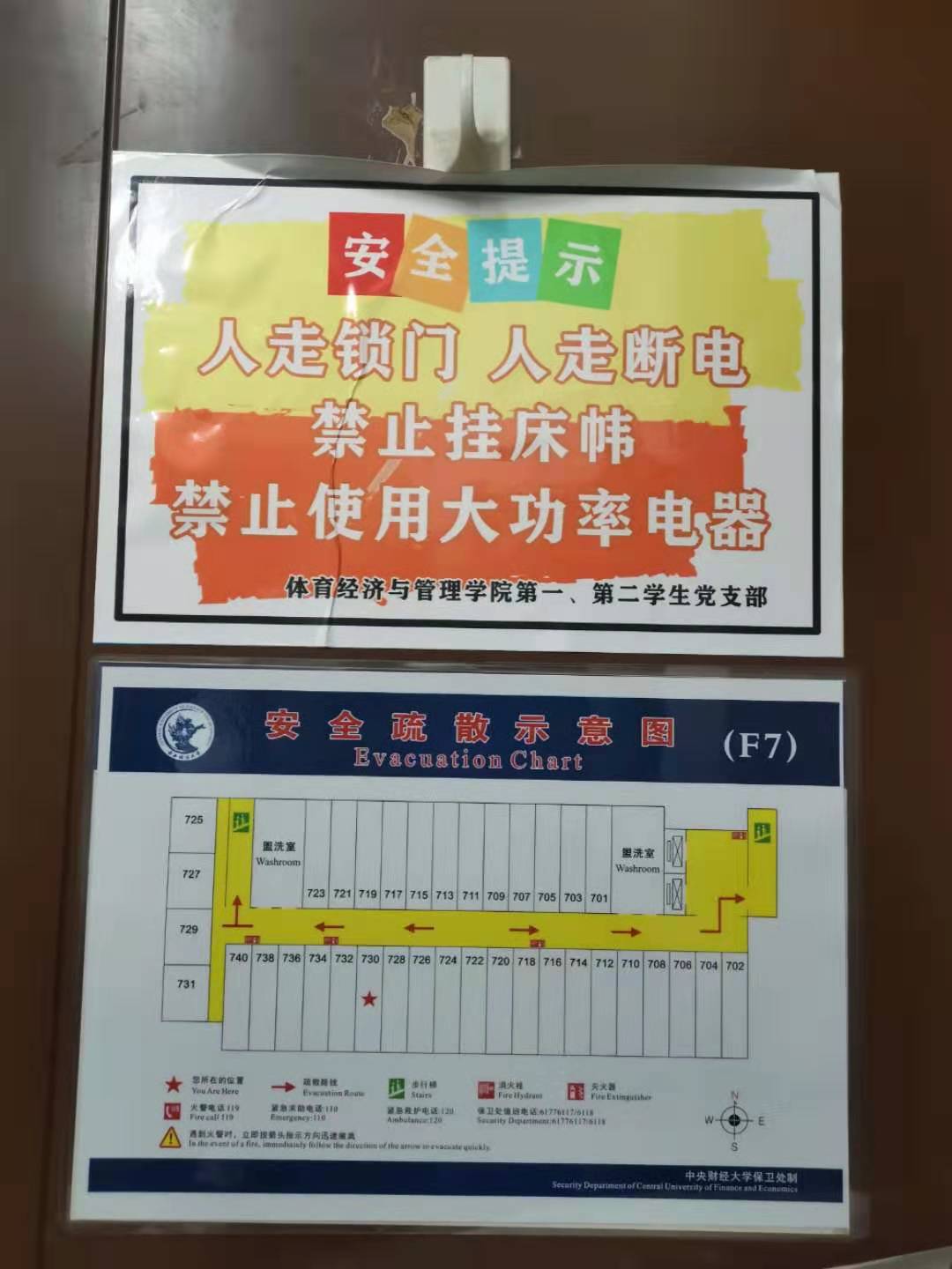 为提高同学们的安全意识,解决在宿舍安全检查中出现的安全问题,消除宿舍安全隐患,我院第一、第二学生党支部10月15日至30日设计制作了安全门贴,针对在宿舍安全检查中集中出现的问题,门贴内容设计为“人走锁门,人走断电,禁止挂床帏,禁止使用大功率电器”,在10月30日至11月4日期间由我院第一、第二学生党支部的党员和积极分子在宿舍内宣传安全知识并组织张贴安全提示。