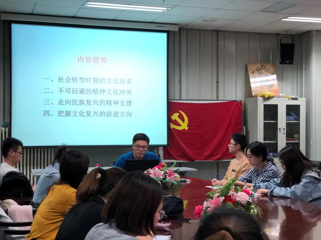 为深入学习贯彻习近平新时代中国特色社会主义思想和党的十九大精神,持续推进“两学一做”学习教育常态化制度化,结合我院第二学生党支部2019年党员先锋工程计划有关安排,积极响应研究生院关于举办“扬传统文化之魂,铸中华复兴之梦”主题宣讲月有关通知,5月14日晚21:00,我院第二学生党支部邀请北京市高校博士生理论宣讲团讲师翟昕于沙河校区体育馆二楼会议室为研究生党员讲授《当代中国人的文化诉求与精神支撑——学习习近平总书记关于思想文化建设系列重要讲话精神》专题党课。