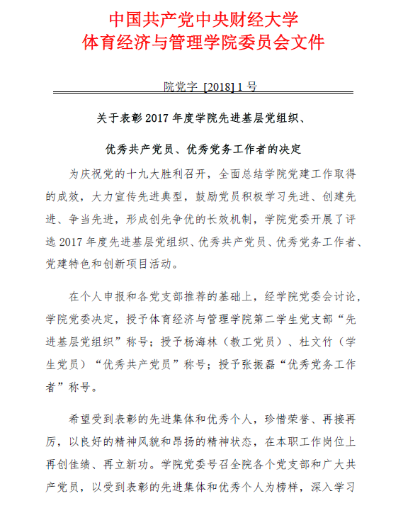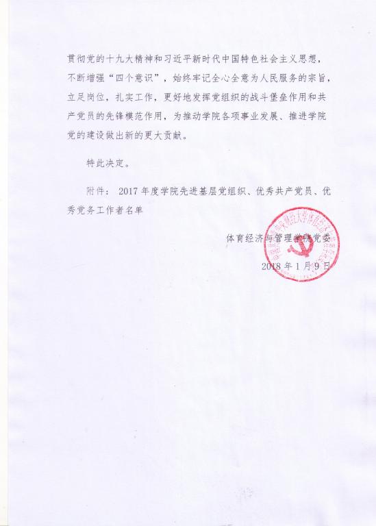 关于表彰2017年度学院先进基层党组织、优秀共产党员、优秀党务工作者的决定