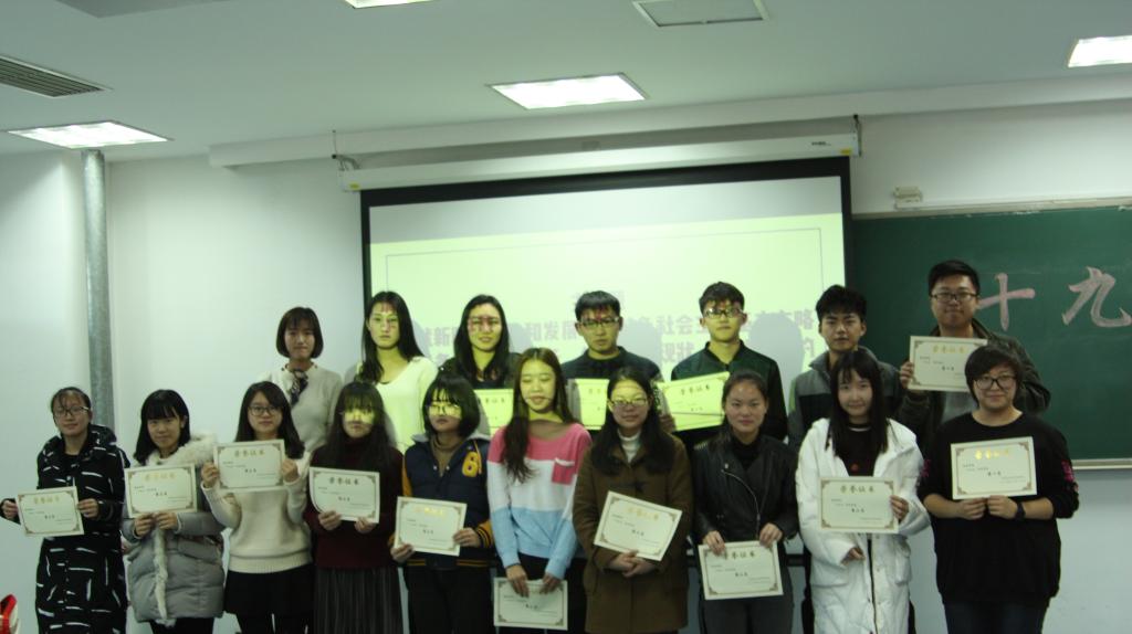 五个小组按序发言完毕,知识竞赛进入最紧张的投票环节。获得第三名的是第一组(郭晓艺、余文洁等),第二名获得者是第二组(刘子轩、蔡昭伍等),第一名则由第五组(徐琛、马枢佳等)获得。我院学生会主席刘嘉琪同学学生会副主席杨莹昱同学、团委副书记张萍同学为三个优胜小组颁发奖状。