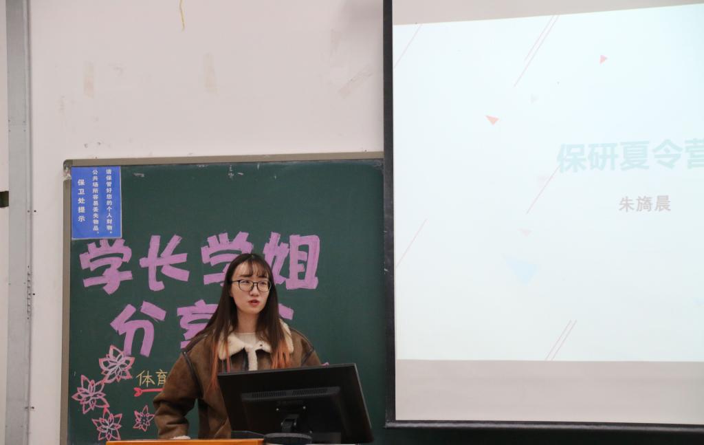 随后,王佳妮同学就“保研干货与大学湿货”进行经验分享。她分享了一些保研资料、自身经历,为在做同学阐述了自己的学习方法,介绍课程类型及所需能力,同时向大家说明了基础知识、逻辑分析和开拓视野的重要性。王佳妮同学鼓励学弟学妹们要多多关注学术期刊,积极参与学术科研,鼓励大家要突破迷茫,努力调整自身心态,积极适应大学生活节奏。