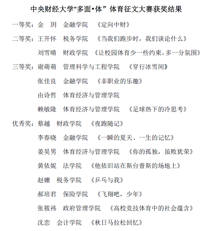 此次征文比赛不仅激发了中财学子对校园体育多维度多层次的思考,更使这份对体育的热爱根植于每位参赛者的心中,为学校推广校园体育迈出坚实的一步。