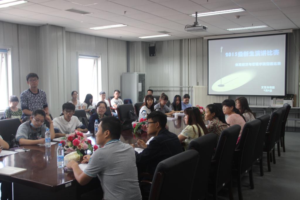 9月8日是新生来到学校的第二天,我院在沙河校区体育馆会议室开展了新生演讲比赛的海选工作。参加此次海选的评委有学院党总支书记林琼老师、团总支书记张振磊老师、团总支副书记孙禹、学生会主席章菁育、副主席丁帅等。此外,还有15级全体同学们到会场观看演讲比赛。