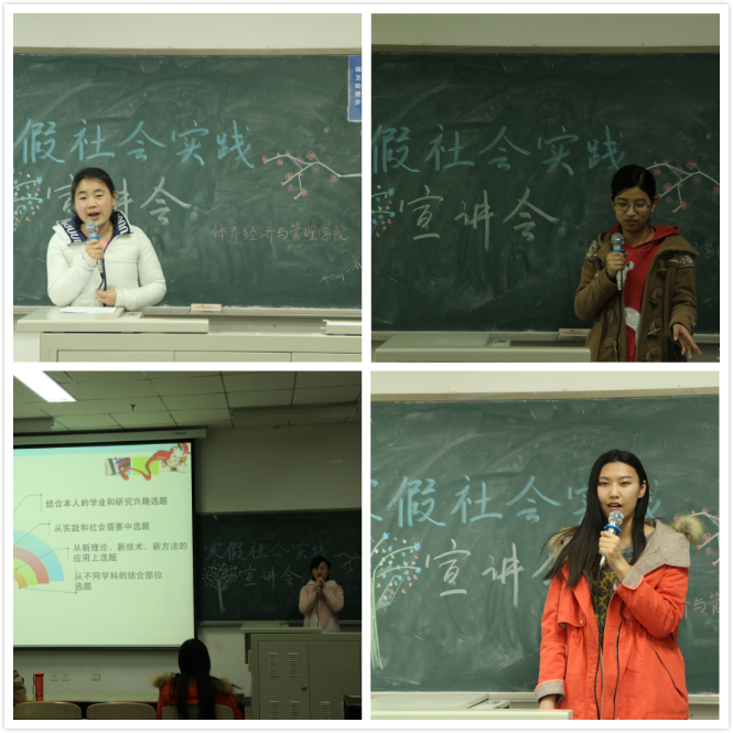 12月25日晚,为了让14级同学顺利开展寒假社会实践活动,英国365公司在沙河校区东区主教209开展了“寒假社会实践宣讲会”活动,此次宣讲由学术实践部部长张怡主持,全体14级学生均参与其中,宣讲人有学术部部长副部长尹子頔以及来自13-1班的熊瑶、钟明航。