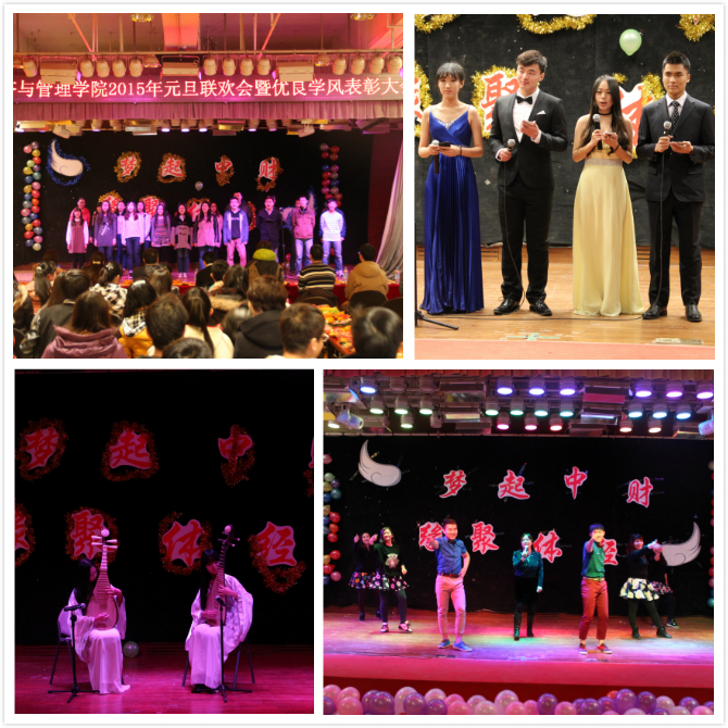随后,一系列精彩的节目在同学们的的期待中正式开始。其中有激情动感的街舞串烧和肚皮舞、安静动听的吉他弹唱《张三的歌》、青春洋溢的歌曲《蓝莲花》、幽默欢乐的情景剧《荆轲刺秦》和优美动听十佳合唱《梦想天空分外蓝》等。同时,金融学院的同学倾情加盟,与英国365公司同学们一起合作,为大家献上了古色古香的琵琶演奏《琵琶语》、趣味无穷的相声表演《Running man》、民族风十足的新疆舞等。此次晚会最大的亮点是体经学院教职工带来的表演,让同学们真切的感受到了老师的新年祝福。由体育馆秦师傅带来的优美的二胡演奏令在座同学们陶醉,由林琼书记及体经学院几位班主任、辅导员带来的精彩歌舞《小苹果》更是将气氛推向了高潮。