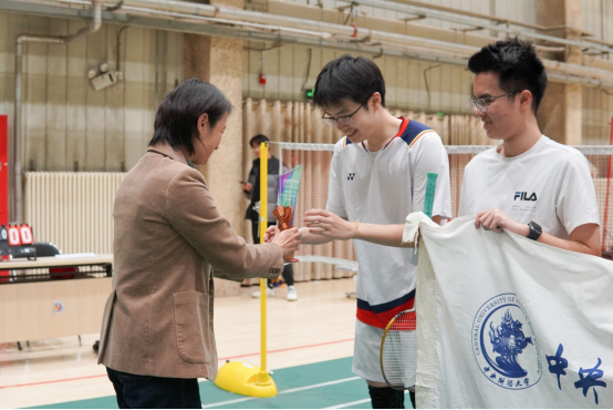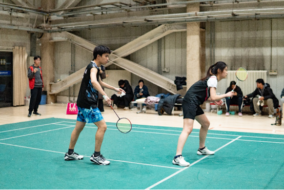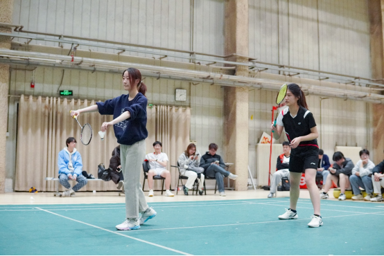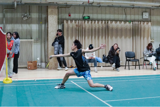 场内击球声与喝彩声相互交织,场上选手展开多拍回合对攻。男单选手在后场连续击出高远球以拉开空间,随后突然变线吊至网前;女单选手以低重心接发后,迅速平抽快挡,并衔接网前扑球;男双组合灵活轮转补位,前半场封网与后半场杀球配合默契;女双选手以平抽压制对手起球,随后连贯跟进扣杀;混双选手则通过前后场拉吊调动对手,抓住空档推对角得分。赛场下,同学们尽责担当啦啦队员,喝彩声、加油声此起彼伏。选手们不服输、不放弃的精神,不仅赢得了掌声,更赢得了尊重。