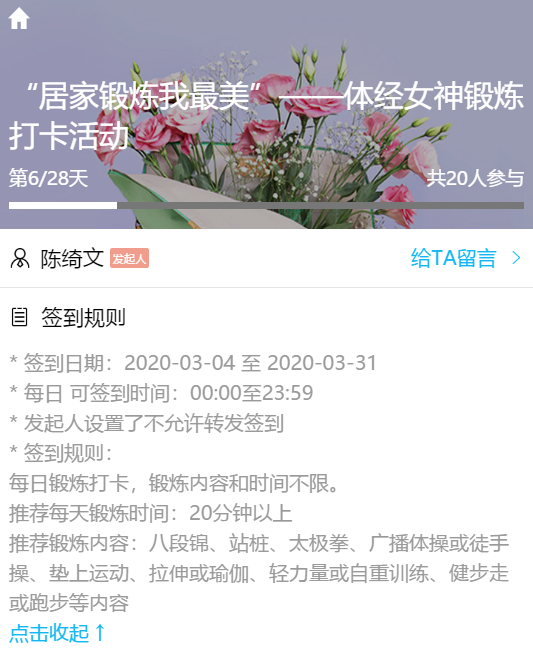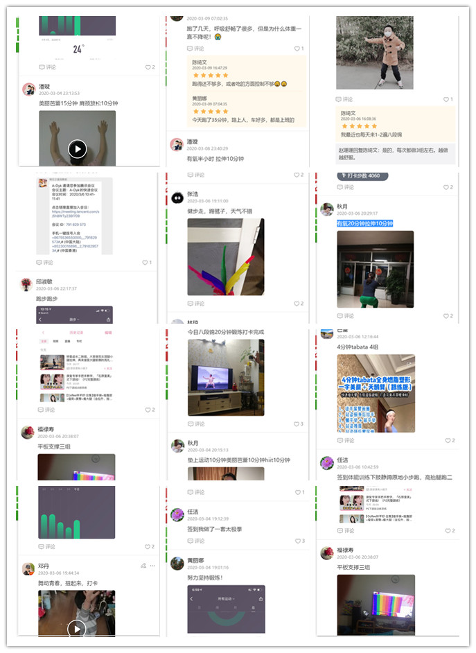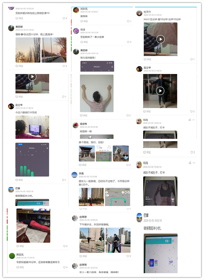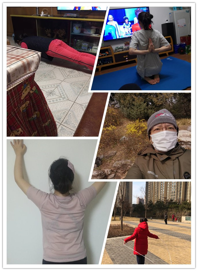 本次活动自2020年3月4日开始,我院20(共23)名女教工人积极参与到本次活动中。大家根据自己的爱好,因地制宜,通过开展不同的运动来锻炼身体,积极打卡,传递出积极向上的精神状态。
