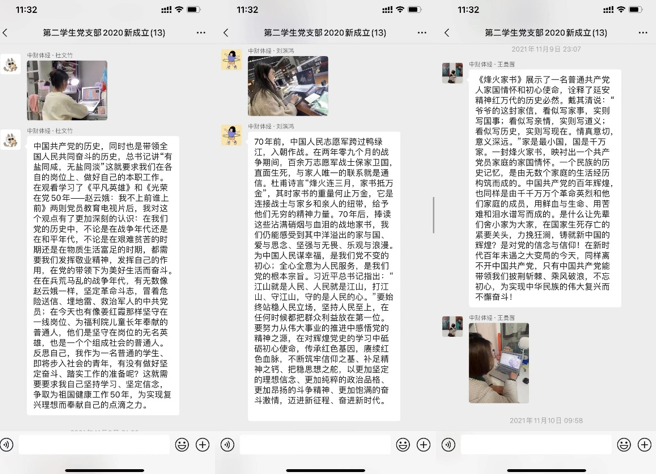 为全面贯彻习近平总书记在党史学习教育动员大会上的重要讲话精神,采用多种途径进行党史学习教育,巩固深化“不忘初心、牢记使命”学习成果。我院第一学生党支部于11月9日晚开展了党员教育电视片学习活动。在活动中,第一学生党支部组织全体成员采取线上会议的形式集中观看了在“北京市党员教育电视片观摩交流活动中”获得一等奖的作品《烽火家书》,并倡议各位党员同志自行观看其余优秀党员教育电视片作品。在集中观看后,支部通过微信群的形式进行了观看感想的交流。各位党员同志积极参加,活动成功开展。