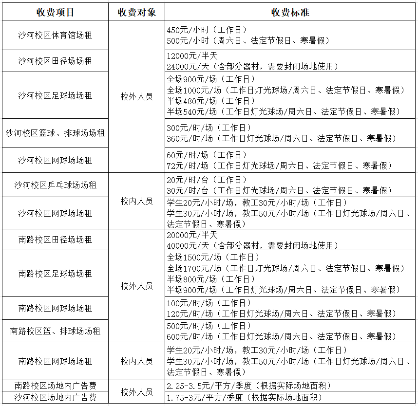 沙河校区场地内广告费 1.75-3元/平方/季度(根据实际场地面积)