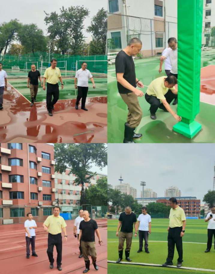 在学院南路校区检查中,发现篮球架底座生锈、足球场和田径场凹陷、配电室屋顶漏洞等问题,王副院长要求工作人员要及时上报进行整改;在沙河校区,重点检查了运动场地及实验室,发现田径场围栏存在倾斜等问题,现场就协调基建处进行解决。